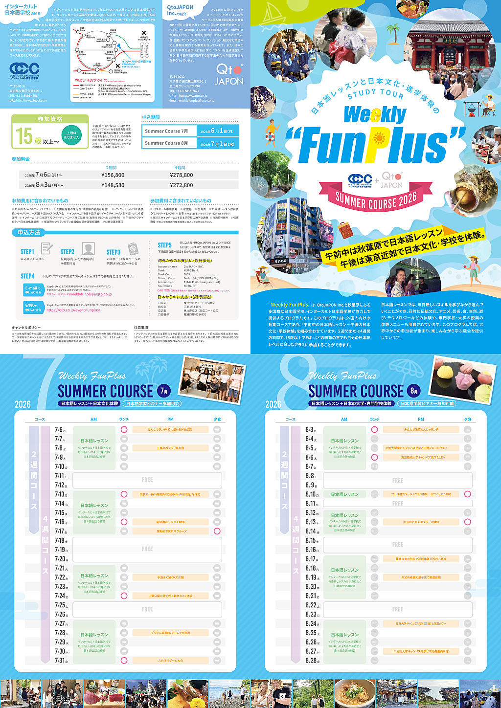 Weekly Funplusは、QtoJAPON Inc.と秋葉原にある多国籍な大手日本語学校、インターカルト日本語学校が協力して提供するプログラムです。このプログラムは、外国人向けの短期コースであり、「午前中の日本語レッスン+午後と週末の日本文化体験」を組み合わせています。最短で1週間から参加が可能で、15歳以上であればどの国籍の方でも自分の日本語レベルに合ったクラスに参加することができます。